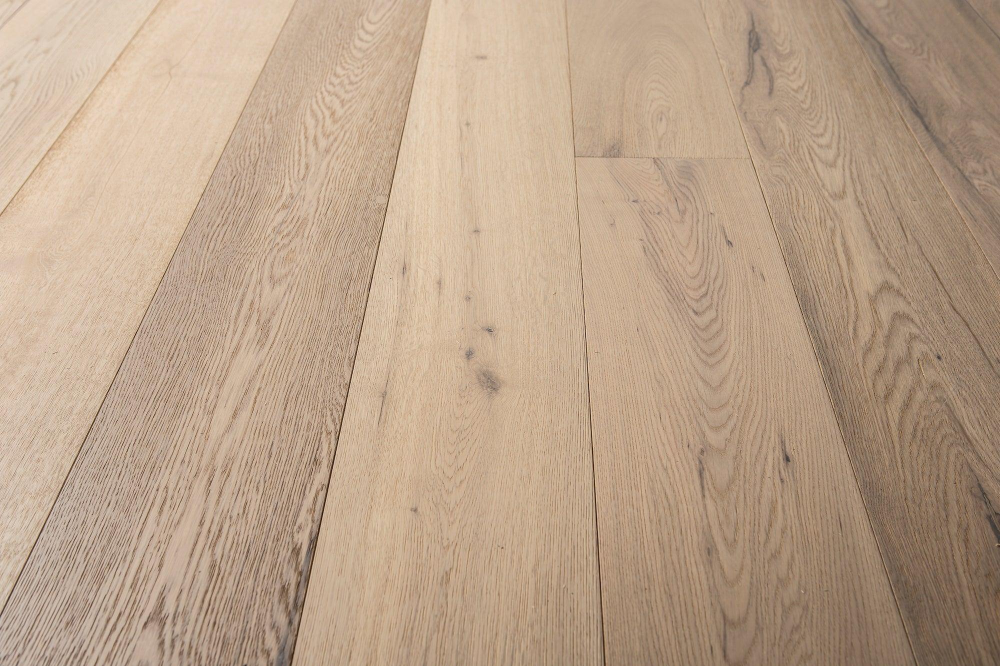 This oak flooring features a whitewash technique and brushed texture, characterized by pastel white tones that are accompanied by faint hints of light red, giving it a warm hue.