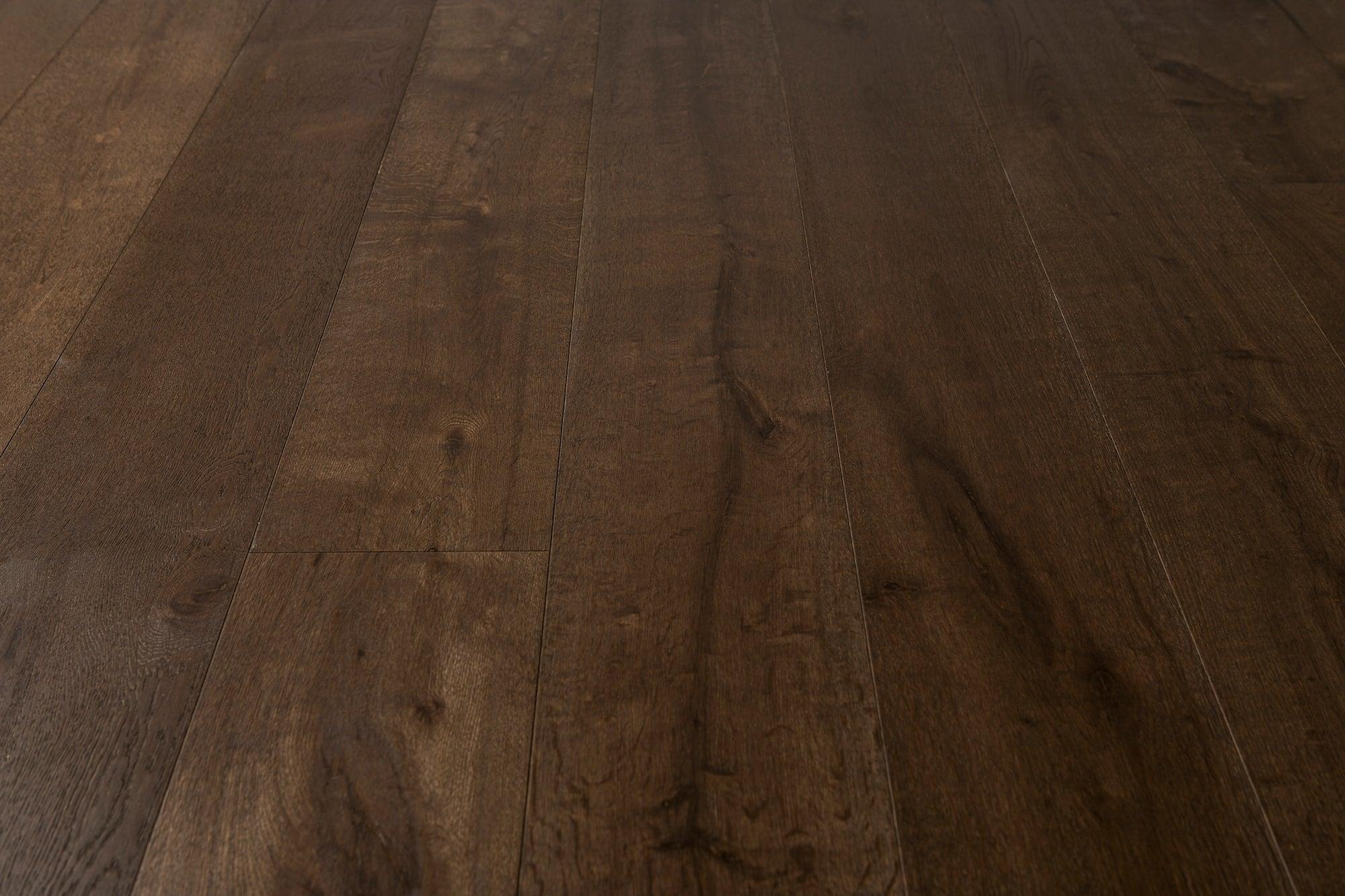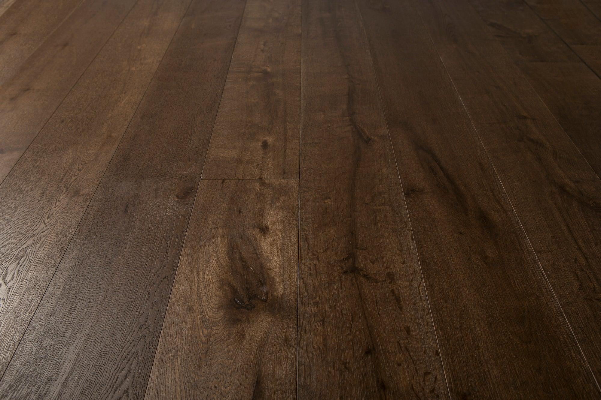 This oak floor is characterized by its warm, rich dark brown stain, wire-brushed texture, and accentuated grain detail.