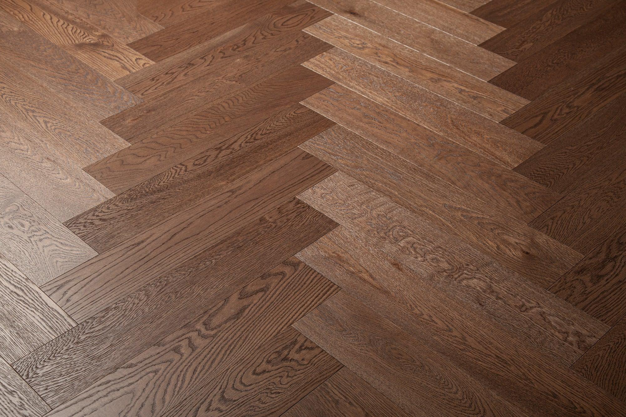 An elegant and timeless appearance, these herringbone oak floors come in a dark stain with coffee brown notes and a natural wood texture finish.